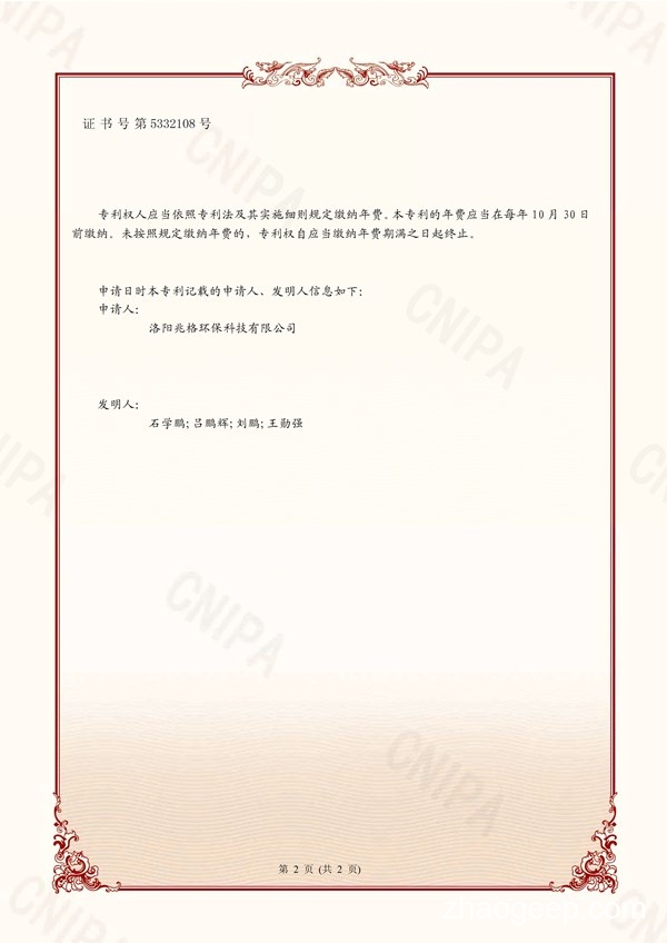 熱烈祝賀洛陽兆格環(huán)??萍加邢薰?/strong>又喜獲一項發(fā)明專利