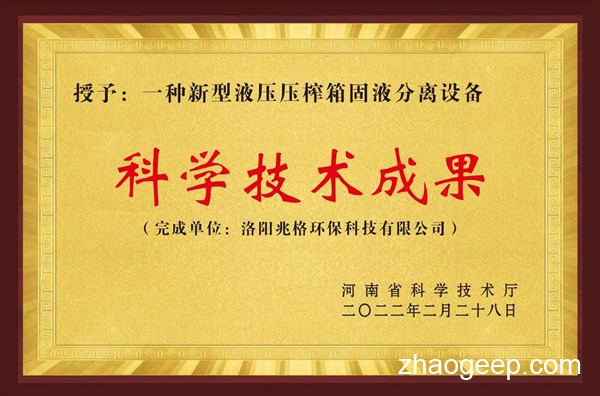 祝賀固液分離專家--兆格環(huán)保”一種新型液壓壓榨箱固液分離設(shè)備“榮獲科學(xué)技術(shù)成果認(rèn)定成功