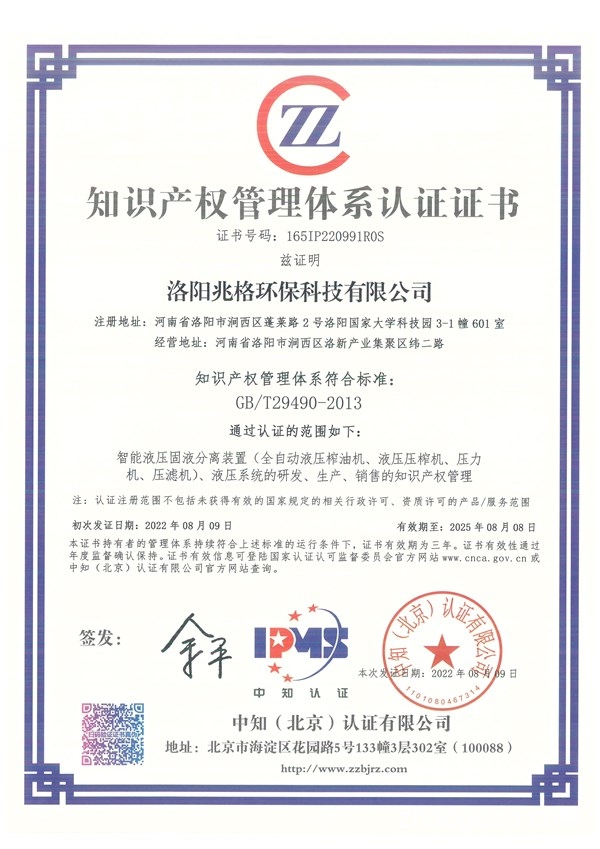 本次洛陽兆格環(huán)保科技有限公司順利通過知識產(chǎn)權(quán)管理體系認證的范圍主要包括:智能液壓固液分離裝置(全自動液壓榨油機、液壓壓榨機、壓力機、壓濾機)、液壓系統(tǒng)的研發(fā)、生產(chǎn)、銷售的知識產(chǎn)權(quán)管理。通過此次認證,將進一步提升洛陽兆格環(huán)??萍加邢薰镜闹R產(chǎn)權(quán)管理水平,實現(xiàn)對知識產(chǎn)權(quán)的獲取、維護、運用和保護,提升企業(yè)競爭力有著重大意義。