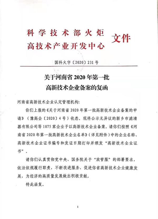 洛陽兆格環(huán)保科技有限公司自2018年開始籌備高新技術(shù)企業(yè)培育工作,高新技術(shù)企業(yè)認(rèn)定伴隨著企業(yè)發(fā)展,經(jīng)過3個年度的努力,2020年6月兆格環(huán)保提報了2020年一批次高新技術(shù)企業(yè)認(rèn)定審核,并且順利通過。2020年12月科學(xué)技術(shù)部火炬高技術(shù)產(chǎn)業(yè)開發(fā)中心復(fù)函,自此兆格高新技術(shù)企業(yè)編號確定為GR202041000826。高新技術(shù)企業(yè)證書于2021年1月領(lǐng)取。