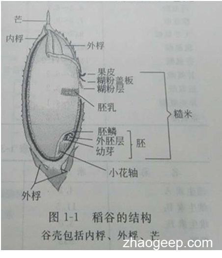 米糠(rice bran)是稻谷(Oryza sativa)脫殼后依附在糙米上的表面層,它是由外果皮、中果皮、交聯(lián)層、種皮及糊粉蓋板層組成的(稻谷加工脫除稻糠(俗稱谷糠、大糠、統(tǒng)糠)之后,在碾制糙米時將糙米外層的果皮、糊粉蓋板、糊粉層、米胚脫掉集中起來,焦作米糠)。其重量約占稻谷粒重量的5%-5.5%。如果將混在其中的米胚包括進(jìn)去,其重量則占稻谷粒的7.5%-8.0%。稻谷中的稻殼占16%-20%,糙米占80%。糙米中的精白米占72%,米胚占2.5%,米糠占5%-5.5%。稻谷的結(jié)構(gòu)如圖所示: