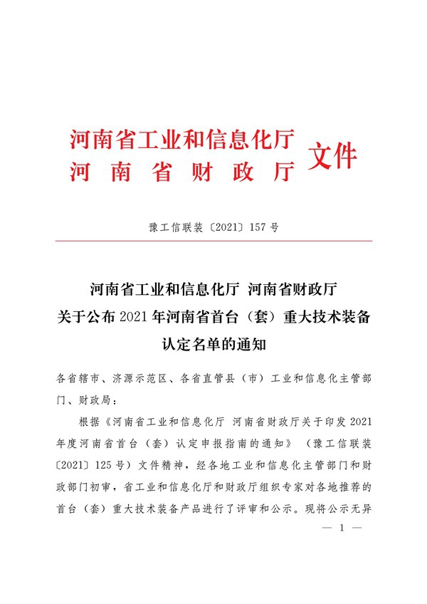 河南省首臺(套)重大技術(shù)裝備認定紅頭文件