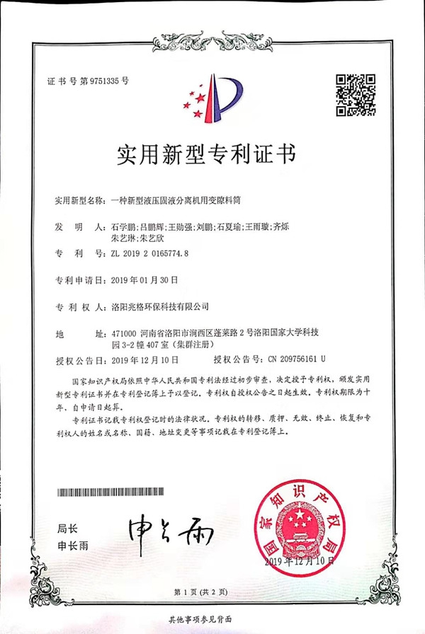 該裝料結構我公司申請有實用新型專利,專利名稱“一種新型液壓固液分離機用變隙料筒”,專利號“ZL 2019 2 0165774.8”。